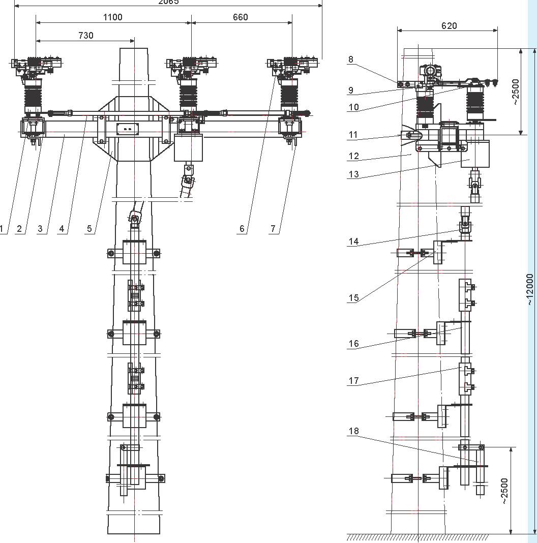 The MFKW18A-12 high-voltage external AC switch consists of a disconnector, a breaker, and a spring operating mechanism. The chopper is made of insulating material with excellent electrical characteristics, high resistance to arc discharge, high temperature resistance and high mechanical strength. A quick spring mechanism installed inside the breaker ensures that the operator’s speed does not affect the opening of the load current. The spring-loaded operating mechanism allows closing and opening operations using the energy stored during manual rotation of the traction lever. This mechanism works stably and reliably, is not subject to the influence of external factors and can ensure the fixation of the switch in the open or in the closed position. After opening, protection and insulation are performed by a visible air gap between the open contacts.