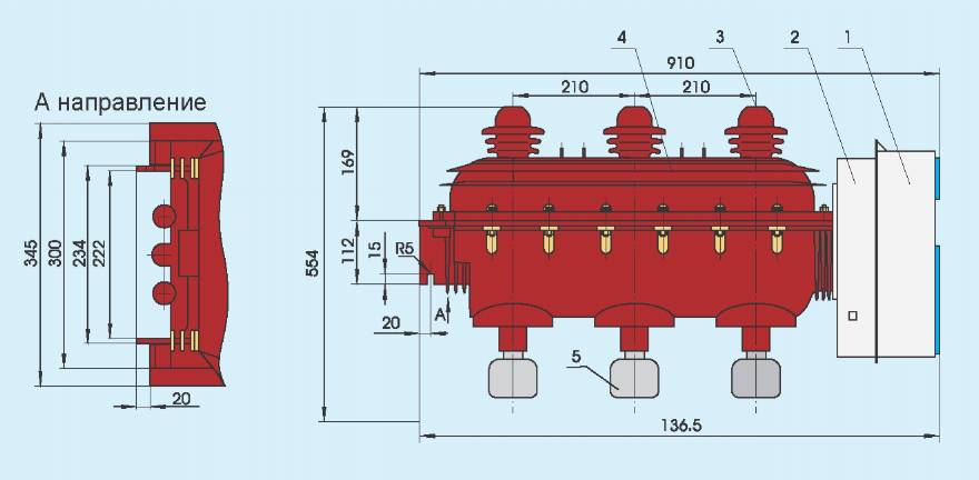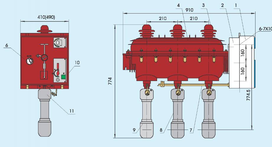 The upper and lower shells of the epoxy compound form an internal cavity filled with air. The movable contacts rotate cyclically to perform operations on, off, grounding. In addition to the electric drive, a manual spring drive can be installed, which provides remote control.