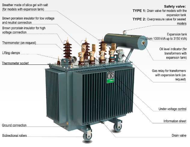 Distribution transformers oil-immersed with power rating from 25 to 2500 kVA and Voltage 6-36/0,4 (0.23)kV. In 50/60 Hz, power transmission and distribution system for power supply and lighting in industrial and agricultural field. Distribution transformers are produced with nominal Voltage in primary winding 6 up to 36 kV. Nominal Voltage in secondary winding is 0,4 or 0,23 kV. Scheme and connection group of windings U/Un-0 or D/Un-11, etc. On the customer demand, it is possible to make transformers with different connection of the Voltage s and other construction solution. Regulating the Voltage is made as a result of moving the switch, by the transformer detached from the net both high (HV) and low (LV) Voltages.