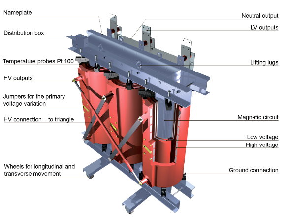 Dry type transformers has been cast with epoxy resin, both cooling by fan and natural (ANAF), thermal class F, three-phase, 50/60 Hz.